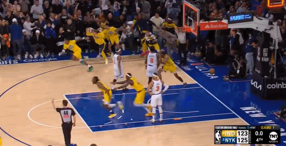 常规时间最后时刻,步行者指挥官哈利伯顿运球推进到前场,在尼克斯中锋米切尔-罗宾逊面前撤步踩着三分线压哨出手,皮球弹得很高,随后掉进篮筐,将比赛拖进加时。加时赛最后2分钟,哈利伯顿2中1。