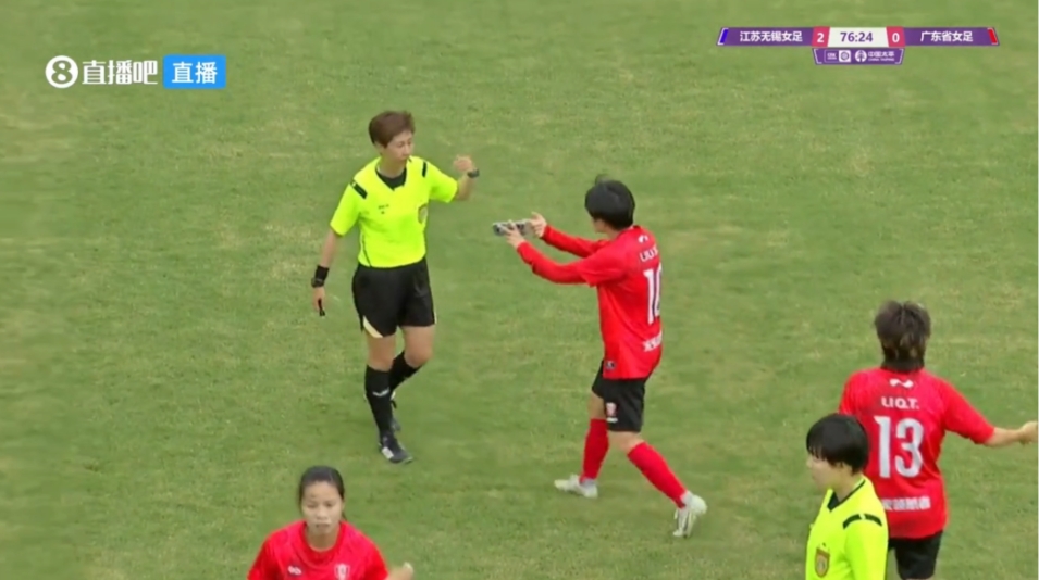 然而,在广东女足多名球员还在向主裁抱怨时,江苏无锡女足发起了一波反击并再次打入一球。随后,双方中断比赛,广东队一球员拿出手机给裁判看回放,裁判看了一眼后挥手维持原判。中断时间长达7分钟。